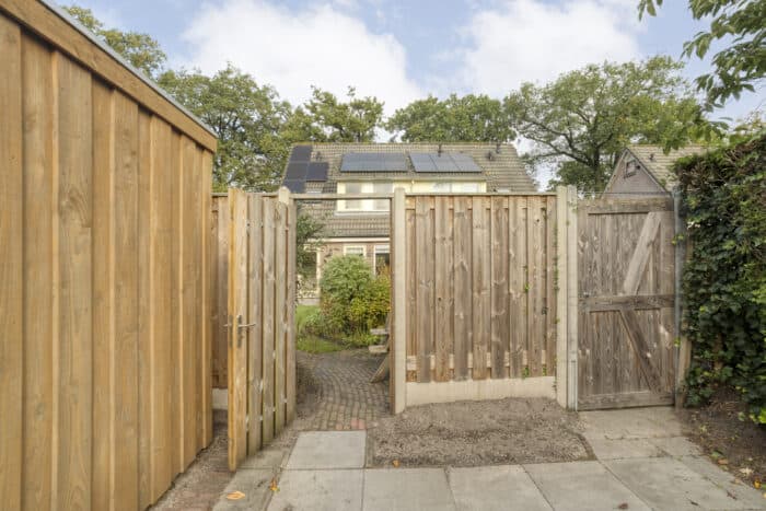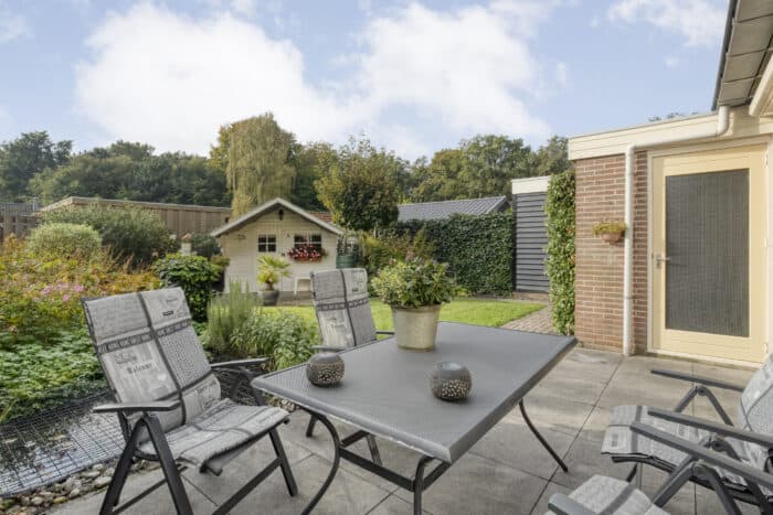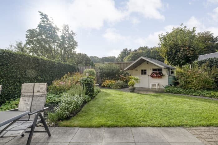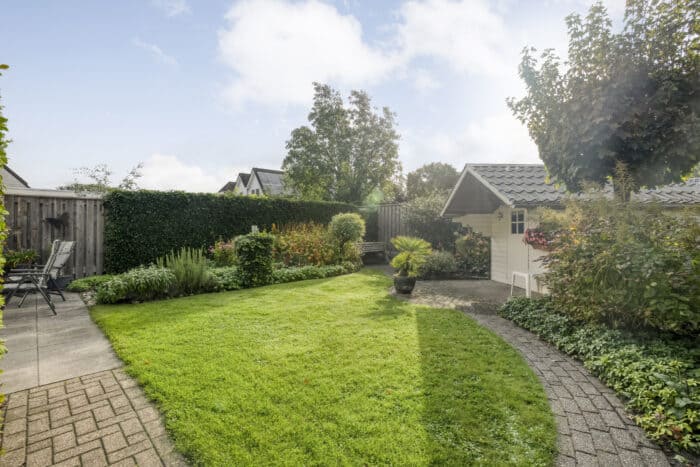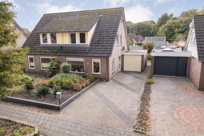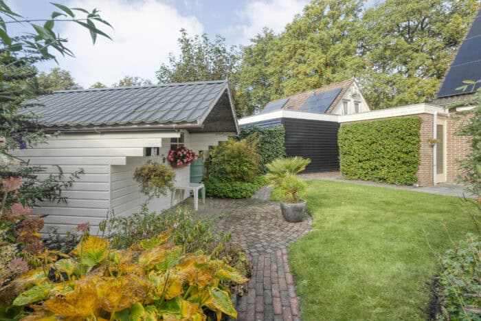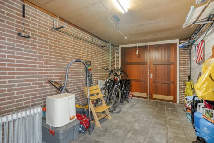 Een extra pluspunt is de aangebouwde garage, ideaal voor wie graag klust, extra bergruimte zoekt of misschien droomt van een hobbyruimte aan huis. Naast de woning loopt een pad richting de achtertuin, en er is bovendien een ruime achterom via de Eikenlaan, een praktische en fijne toevoeging.