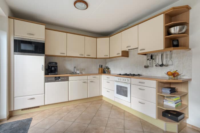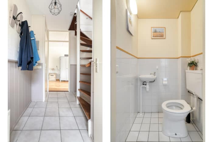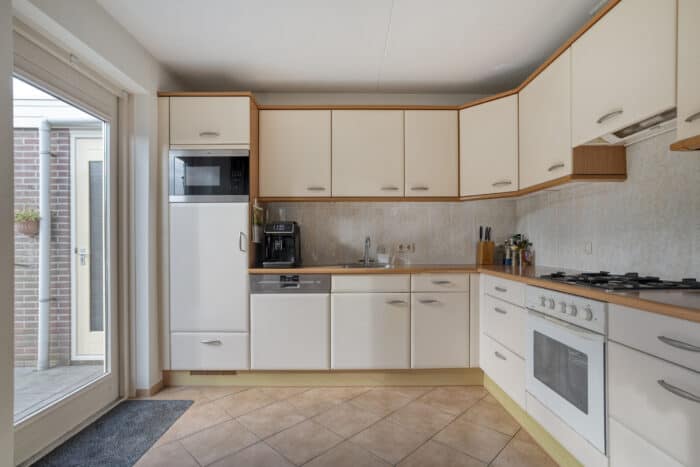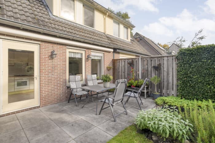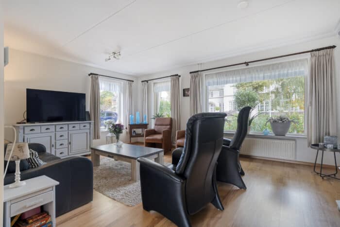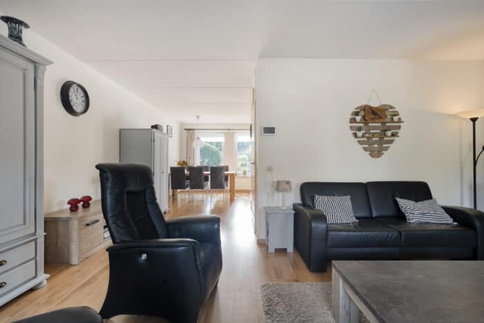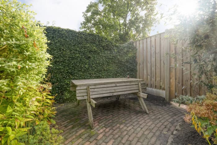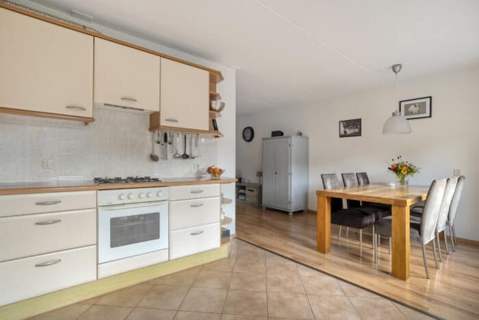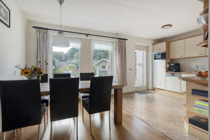 Binnen valt direct het vele daglicht op dat de ruimtes binnenstroomt, wat bijdraagt aan een aangenaam en huiselijk gevoel. De woonkamer aan de voorzijde van de woning voelt licht en ruimtelijk aan, terwijl de keuken en eethoek aan de achterzijde juist gezellig en praktisch zijn ingericht. Vanuit de eethoek stap je zo de zonnige achtertuin in, die op het zuiden ligt. Hier kun je in alle rust genieten van het buitenleven, of je nu graag tuinieractiviteiten onderneemt of liever ontspant met een goed boek, hier kan het allemaal.