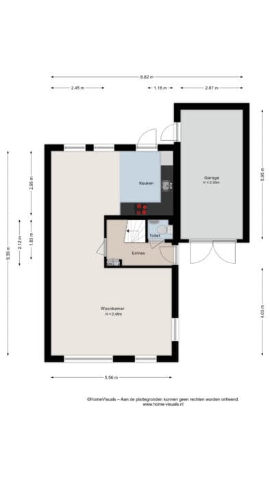 Begane grond: Entreehal met trapopgang, toilet met fontein, woonkamer, eethoek, open keuken, garage.