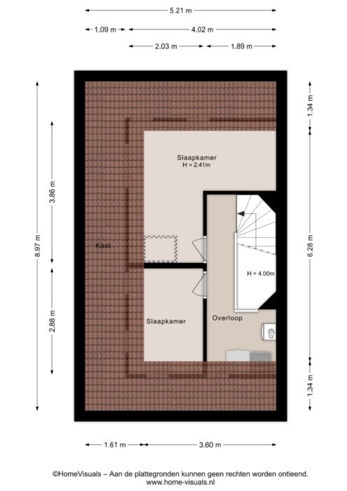 Tweede verdieping: Overloop met witgoed aansluiting, twee zolder-/slaapkamers.